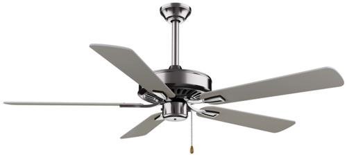 The Minka-Aire F556-BN Contractor Plus collection 52" Energy Star indoor ceiling fan (with pull chain control) in Brushed Nickel brings Traditional style. This fan includes Five Silver Blades and the hanging height is 13". The voltage is 120 volts. Additional Information: Control - Three-speed pull chain with manual reversing switch; Downrod - Includes 3 1/2" and 6" (3/4" Interior Diameter) Poles